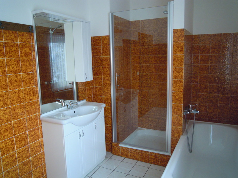 - Sanitärbereich: Waschtisch, Badewanne, Dusche und WC