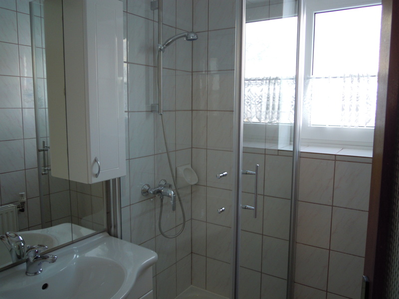 - Sanitärbereich: Waschtisch und Dusche. Separates WC